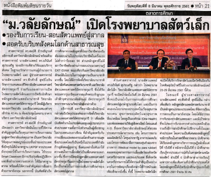 หนังสือพิมพ์ 09 มีนาคม 2561 ฮิต: 521 ม.วลัยลักษณ์ เปิดโรงพยาบาลสัตว์เล็ก ให้เรตสมาชิก: 0 / 5 Tags: มติชน